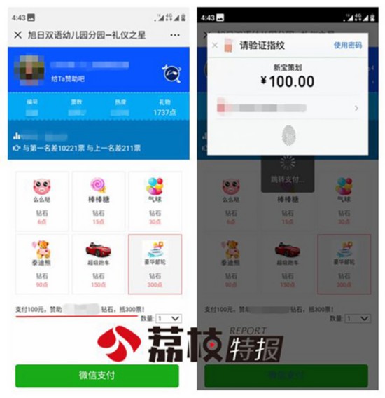 南京市民贾先生告诉江苏新闻广播记者,从上周开始,他孩子所在的南京市江北新区旭日双语幼儿园分园举办了一个名为“礼仪之星”的活动,两百多名幼儿通过在微信小程序上投票,选出“礼仪之星”,当选的小朋友将获得奖品。但是投了几天票后,贾先生发现,自家孩子的投票数量被锁定了。想继续投票,要么等一段时间,要么花钱买“礼物”。只要通过微信支付买了“礼物”,投票立即解锁。
