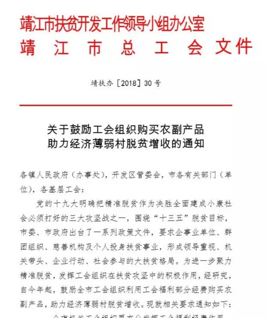最近,为进一步聚力精准脱贫,发挥工会组织在扶贫攻坚中的积极作用,靖江市扶贫办、靖江市总工会联合发文,自今年起,鼓励靖江全市工会组织利用工会福利部分经费购买农副产品,助力经济薄弱村脱贫增收。