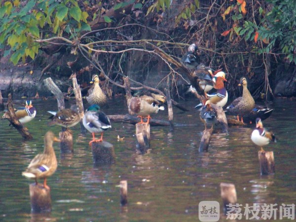 附近环卫女工人称,今天看见好多鸳鸯和野鸭,它们今年飞来得比往年早,还没有人来拍摄,这让最先欣赏到的环卫工人们兴奋不已。