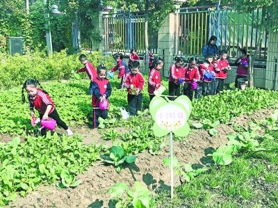 农耕课是高车幼儿园大班的必修课。幼儿园在园区里专门开辟了一块200多平方米的农场,让孩子们在不同季节亲手种下时令蔬菜,并定期照料和观察蔬菜的生长状态,体验农耕乐趣。记者在现场看到,农场里的白菜、菠菜长得葱葱郁郁。