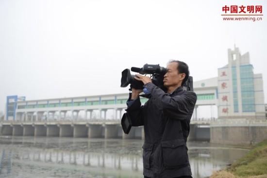 2015年11月高思杰在阜南县淮河王家坝采访。戴文学摄