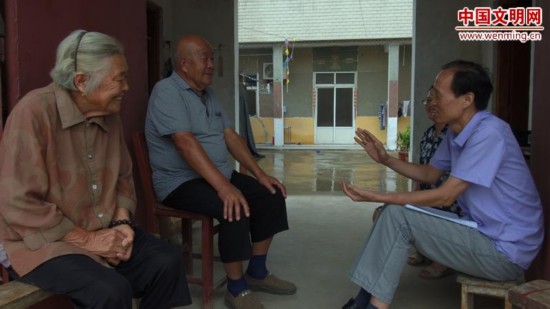 2018年9月6日,高思杰(右一)在颍上县赛涧乡溜孜口庄台采访李兆局大爷(左二)和张永琴大妈(左一)。徐建平摄