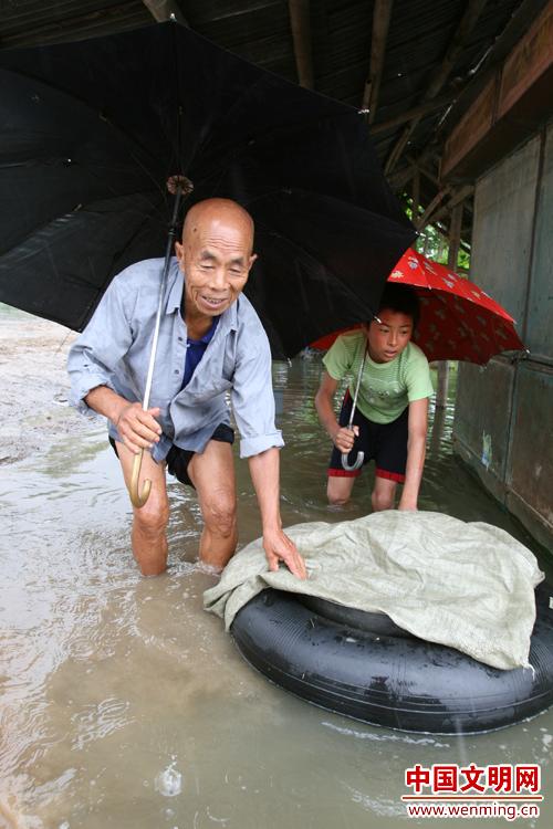 2007年7月17日拍摄的洪水中的阜南县王家坝镇李郢村刘庄庄台的百姓生活。戴文学摄