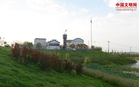 庄台南面靠近淮河故道的是原生态的草皮护坡,顶端一排紫薇绚烂绽放,仿古的防水城垛守护着庄台,白墙灰瓦的四排民居整齐排列,东端后排是村委会、党员活动室、村民服务厅、自来水供水塔,西端中部是淮河人家古民居,陈列着古色古香的生产生活用具。环绕庄台的柏油路用白色的边界线与纵横贯通的巷道连接,庄台内外桂花、翠竹与各色绿植相映成趣,成群的鸟儿飞来飞去,时不时还要亮亮清脆的歌喉。