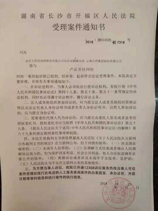 澎湃新闻从刘高提供的开福区法院《受理案件通知书》看到,刘高与益丰大药房连锁股份有限公司长沙双拥路分店、云南白药集团股份有限公司产品责任纠纷一案,经审查,起诉符合法定受理条件,决定立案审理。“益丰大药房连锁股份有限公司长沙双拥路分店”是刘高购买云南白药牙膏的药店,一同成为被告。