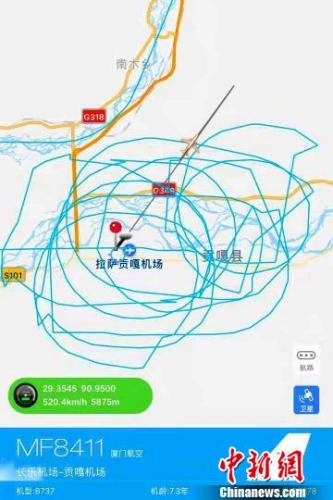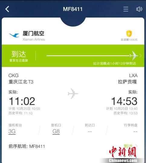 飞行信息显示,MF8411航班比预计晚点1个多小时到达拉萨,成功着陆。 江飞波 摄