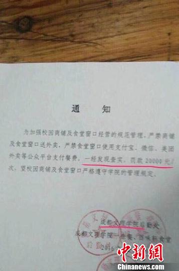 随后,有网友张贴出一张“2016年12月成都文理学院后勤处通知”的照片。照片显示,成都文理学院严禁食堂窗口使用支付宝、微信、美团外卖等公众平台支付餐费,一经发现查实,罚款20000元。