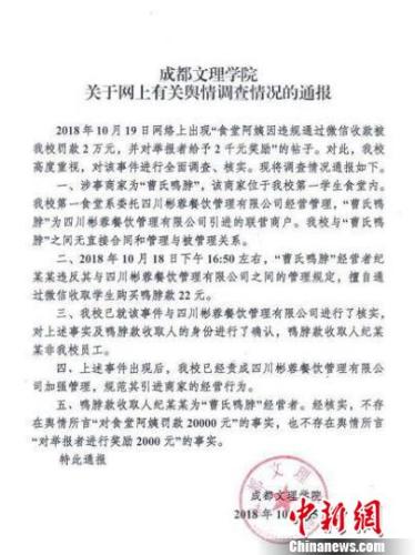 中新网成都10月25日电 (记者 贺劭清)成都文理学院25日发布通报称,经过该校全面调查、核实,不存在舆情所言“对食堂阿姨罚款20000元”的事实,也不存在舆情所言“对举报者进行奖励2000元”的事实。事件发生后,该校已责成食堂的经营管理公司加强管理,规范其引进商家的经营行为。