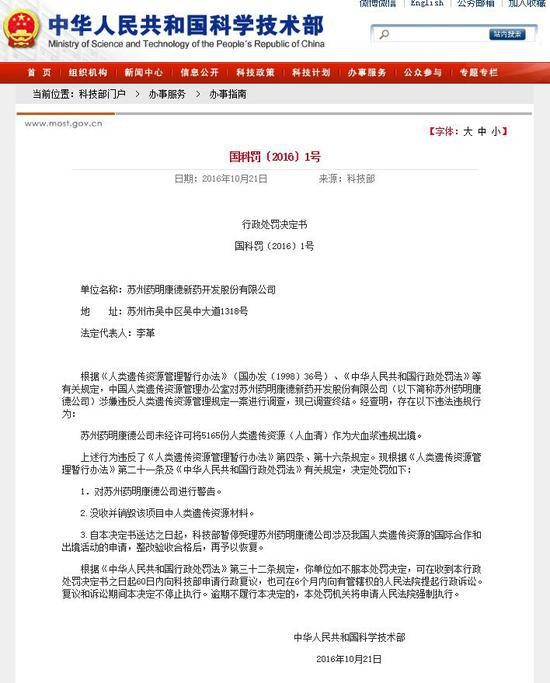 科技部在2016年10月21日对药明康德子公司苏州药明康德新药开发股份有限公司(简称苏州药明康德公司)出具处罚决定书。