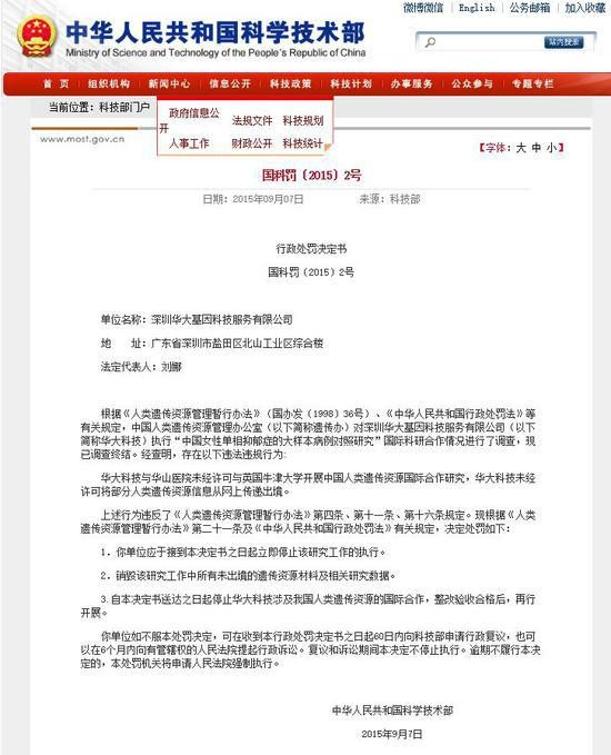 2015年9月7日,科技部对华大基因子公司深圳华大基因科技服务有限公司(简称“华大科技”)作出处罚。