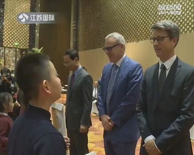 Eager to be the messengers of friendship, children from sister cities abroad and 13 cites in Jiangsu were looking forward to giving away their paintings as gifts. These two children from sister cities of Jiangsu presented their paintings to Mr. Wu Zhenglong, and Mr. Guo Yuanqiang respectively. Also contestants from Jiangsu International Youth Painting Contest, these two children brought their love to Jiangsu.