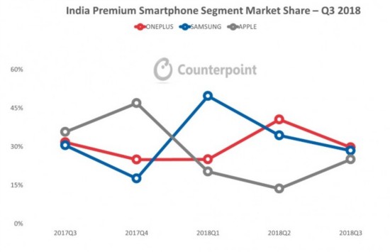 【环球网科技综合报道】据外媒10月25日报道,一加连续两个季度在印度高端智能手机市场上销量排名第一,在3万卢比(约合400美元)的高端智能手机市场上占据了30%的份额,超越了三星和苹果。