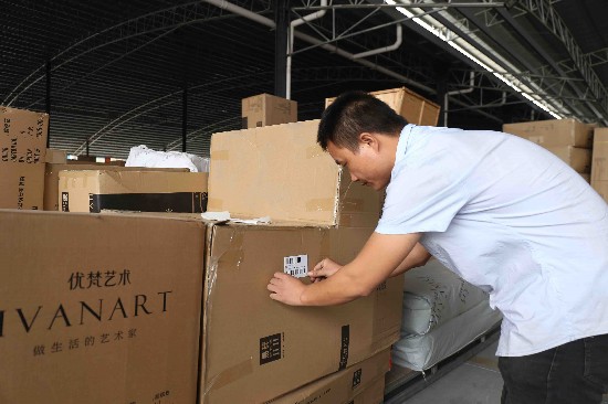 (图说:工作人员给整装待发的家具贴上电子面单)