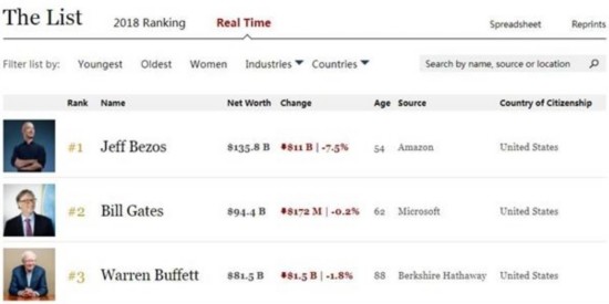 不过,在福布斯实时富豪榜上,贝索斯仍以1358亿美元排名首位。