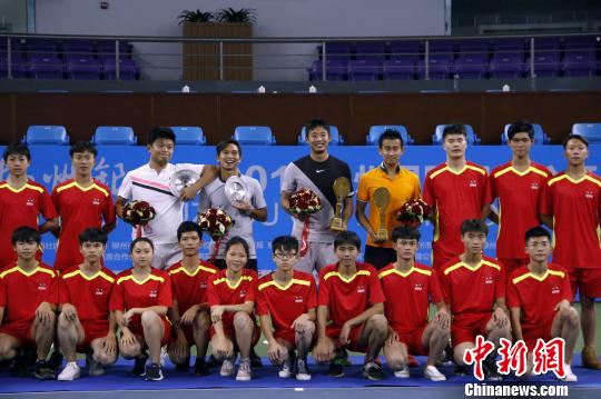 ATP男子挑战赛男子双打冠亚军与志愿者合影。 朱柳融 摄