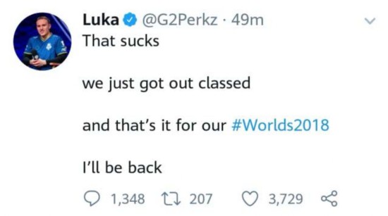 比赛一结束,G2中单Perkz就发推特,表达了对此次失利感想,直言失利的感觉很不好,队伍表现的很糟糕。虽然S8之旅已经结束了,但他表示一定会回来的。