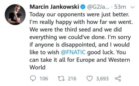 战队打野Jankos也承认了对手很强,他们能走到这一步已经很不容易了,作为三号种子,已经竭尽所能,最后祝FNC好运,希望其能为欧洲和西方赢下冠军。FNC战队的打野也在底下评论“你们已经表现的很好了,整个欧洲赛区都因你们而自豪”。