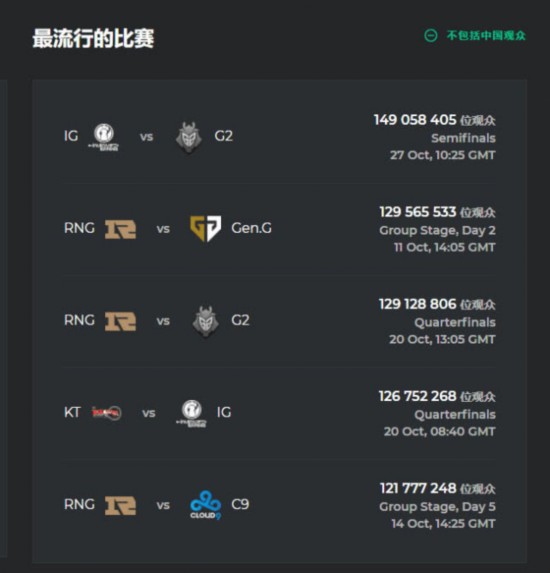 在不包括中国观众的统计中,iG与G2的这场比赛登上了数据榜的第四位,共有122万的外国观众收看了本场比赛。值得一提的是,在榜单前五名中,有四场比赛是欧美队伍的比赛,只有第五位的iG与KT是亚洲对抗,足以见得外国观众对iG这支LPL战队还是非常认可的。