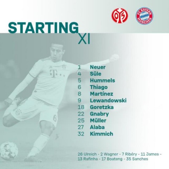 替补:2号瓦格纳、7号里贝里、11号J罗、13号拉菲尼亚、17号博阿滕、26号乌尔赖希、35号雷纳托-桑切斯
