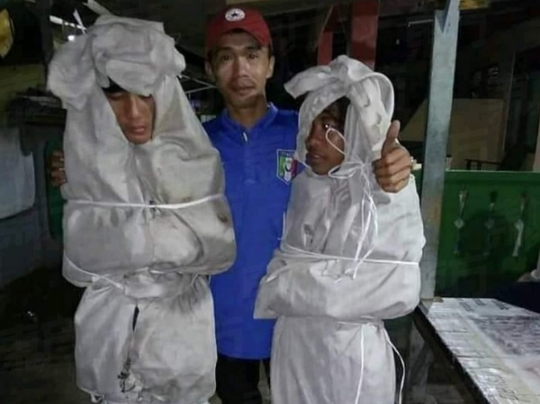 据马来西亚《东方日报》报道,印尼雅加达两少年提前庆祝万圣节,扮成白袍鬼在村里吓人,被警察严惩,将两人带到墓地,要他们在坑里睡一夜。