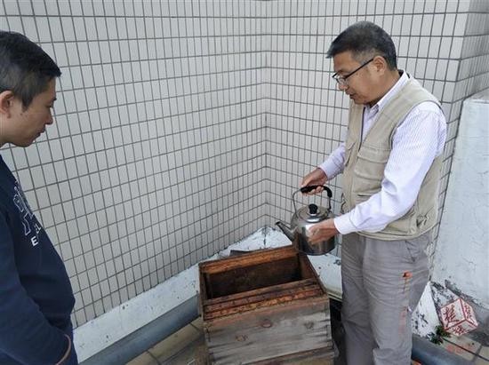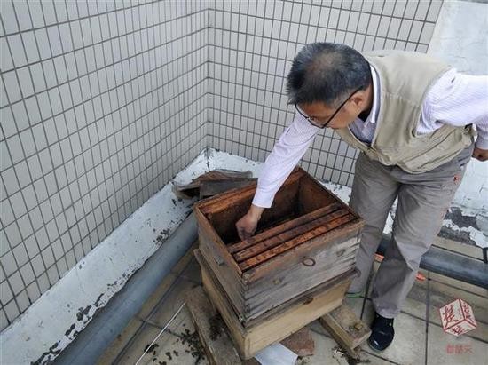26日下午,楚天都市报记者来到小区找到养蜂的李先生。49岁的李先生介绍,他是一位蜂疗师,蜂疗就是用蜜蜂的刺去蛰人体穴位,从而达到治疗和保健的目的。他的父亲就从事养蜂和蜂疗,而他自己从事蜂疗已经二三十年了,而且蜂疗已被武昌区列入非遗项目。因为蜂疗要用活蜜蜂,他这才从2014年开始养了一箱共上千只蜜蜂。这些蜜蜂平时是放在附近的树林里,因秋冬气温下降,花源减少,这才带回小区用糖水和中药材饲养。蜂箱就放在2栋二楼的公共天台上。