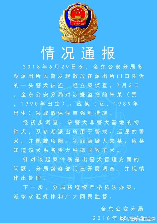 昨天(10月27日)深夜,金华市金东公安分局针对此事发布情况通报。通报称,今年6月29日晚,金东公安分局多湖派出所民警发现散放在派出所门口附近的一头警犬被盗。经立案侦查,7月3日,金东公安分局对涉嫌盗窃的朱某、应某采取取保候审强制措施。经初步调查,该警犬非警犬基地的特种犬,系多湖派出所用于警戒、巡逻的警犬,并佩戴项圈。犯罪嫌疑人朱某、应某知道该犬系名贵犬种德国牧羊犬。针对该起案件暴露出警犬管理方面的问题,分局督察部门已开展调查,并视情作出处理。下一步,分局将继续严格依法办案,诚挚欢迎媒体和广大网民监督。