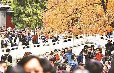 本报讯(记者 王斌)香山公园昨日首次发布游客接待量橙色预警。截至17时,香山公园累计接待游客9.2万人次,游客量创入秋以来新高。北京青年报记者了解到,为应对游览高峰日,香山公园首次将全园分为七个重点区域,定点执勤、全区巡视。今日及下周末仍是香山公园的客流高峰期,提醒市民游客提前网上预约、错峰游览。