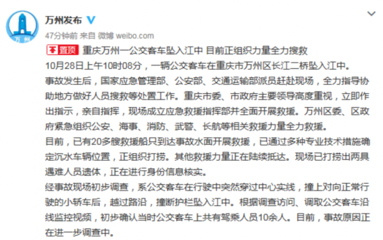 10月28日上午10时08分,一辆公交客车在重庆市万州区长江二桥坠入江中。