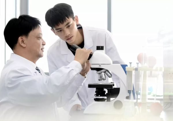 ▲韩宝鑫同学(右)在其求学的江苏护理学院化验室,向班主任刘柏林老师求教精密仪器的操作要领。