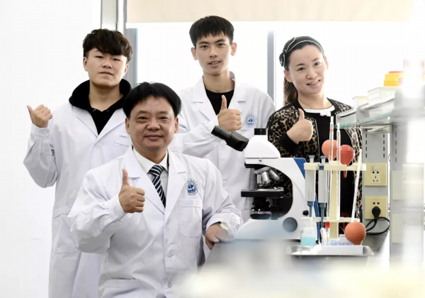 ▲韩宝鑫同学(右二)的班主任刘柏林老师(左二)、辅导员陈颖老师(右)及同学,在实验室留影为其专升本的愿望加油!