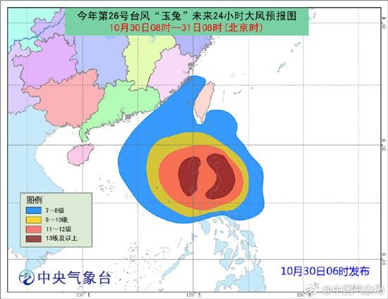 受“玉兔”和冷空气共同影响,30日08时到31日08时,台湾以东洋面、巴士海峡、南海中东部和东北部、台湾海峡有7~9级大风,阵风10~11级,其中南海东部的部分海域、巴士海峡南部风力达10~12级,阵风13级,“玉兔”中心附近最大风力可达13~14级。