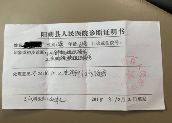 海女士提供的阳朔县人民医院诊断证明书显示,其父经初步诊断,头、左胸腹软组织损伤。其余家人不同程度受伤。“家人医疗花费一千多,加上手机维修,花了近万元。”海女士称。