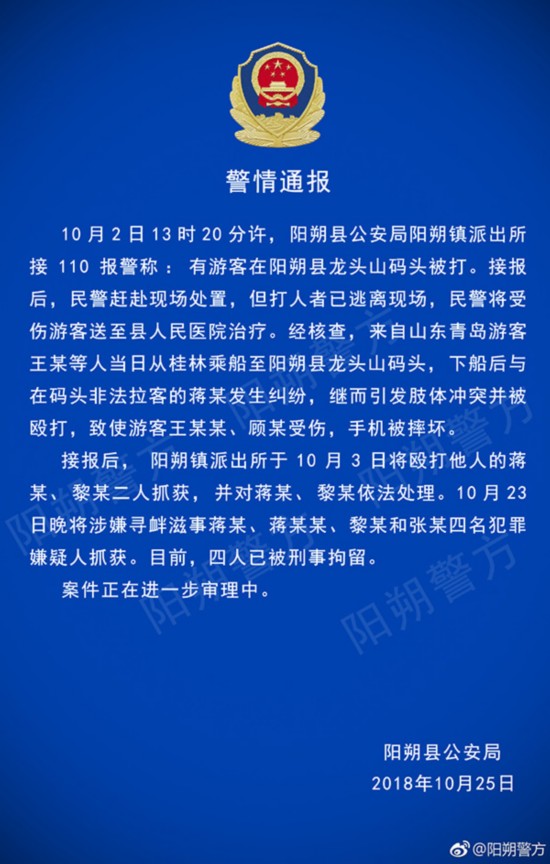 (原标题:游客一家在阳朔因拒付“野导”费用遭群殴,警方已刑拘4人)