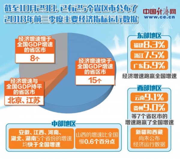 近期,各省区市陆续公布2018年前三季度经济运行“成绩单”。截至10月29日,已有25个省区市公布了主要经济指标运行数据。其中,云南、贵州、江西等15个省区市经济增速快于全国6.7%的GDP增速;北京、江苏的增速与全国持平;其余省区市的增速慢于全国增速。