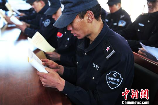 图为10月29日,当曲卡护路大队的队员在学习理论知识。张伟 摄