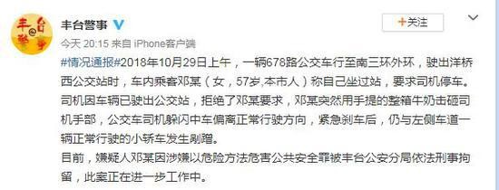 #情况通报#2018年10月29日上午,一辆678路公交车行至南三环外环,驶出洋桥西公交站时,车内乘客邓某(女,57岁,本市人)称自己坐过站,要求司机停车。司机因车辆已驶出公交站,拒绝了邓某要求,邓某突然用手提的整箱牛奶击砸司机手部,公交车司机躲闪中车偏离正常行驶方向,紧急刹车后,仍与左侧车道一辆正常行驶的小轿车发生剐蹭。