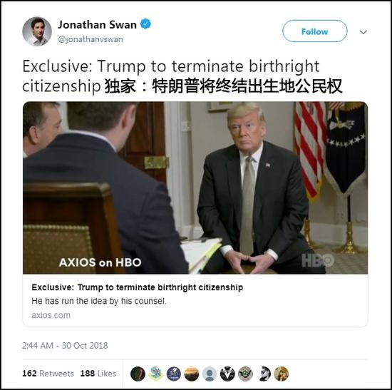观察者网消息 据美国政治新闻网站Axios30日报道,特朗普在接受该媒体独家采访时表示,他计划签署一项行政命令,结束“出生公民权”,即取消非美国公民和非法移民在美国境内生下的孩子出生即可获得美国公民身份的权利。详情》