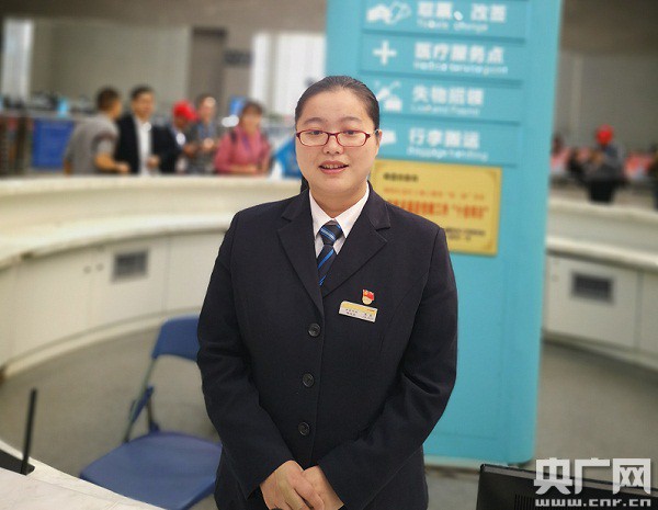 面容亲切、眼含微笑,“80”后姑娘李军在南昌火车站“红土情”服务台前耐心解答着旅客提出的问题。