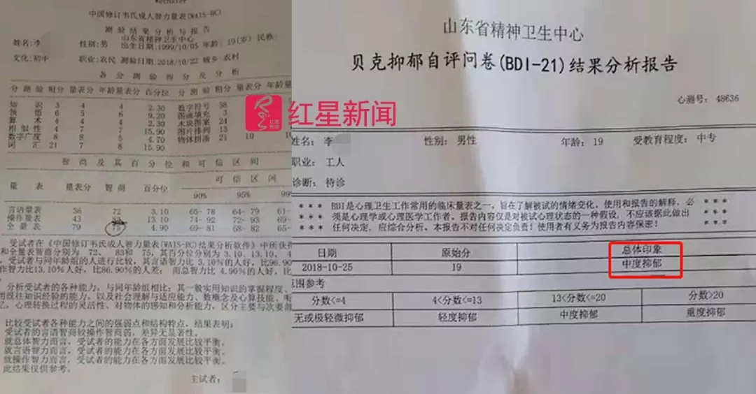 10月份,这一事件曝出后,父母两次将李达送医,他病了。他父母将一沓诊断资料摊开,中度抑郁,智商75,略低。