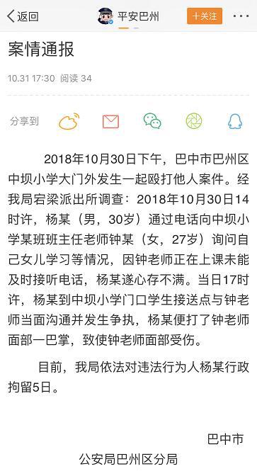据四川巴中市公安局巴州区分局通报,10月30日下午,当地一小学大门外发生一起殴打他人案件。警方调查显示, 10月30日14时许,杨某(男,30岁)通过电话向该小学某班班主任老师钟某(女,27岁)询问自己女儿学习等情况,因钟老师正在上课未能及时接听电话,杨某遂心存不满。当日17时许,杨某到该小学门口学生接送点与钟老师当面沟通并发生争执,杨某便打了钟老师面部一巴掌,致使钟老师面部受伤。目前,警方已依法对违法行为人杨某行政拘留5日。