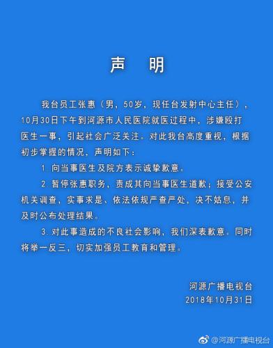 声明称,广东河源广播电视台员工张惠(男,50岁,现任台发射中心主任),10月30日下午到河源市人民医院就医过程中,涉嫌殴打医生一事,引起社会广泛关注。