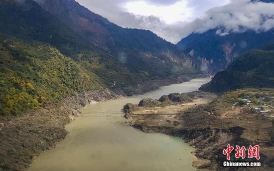 10月20日,西藏雅鲁藏布江堰塞湖自然过流,水位下降后被淹山体露出水面。10月19日13时30分,西藏雅鲁藏布江米林县堰塞湖开始自然过流。截至20日7时,雅鲁藏布江堰塞湖坝前水位已下降56米,估算留存水量1.6亿立方米,堰塞湖洪水威胁得到缓解,防洪安全风险大大减轻,并将继续降低。中新社发 钟欣 摄