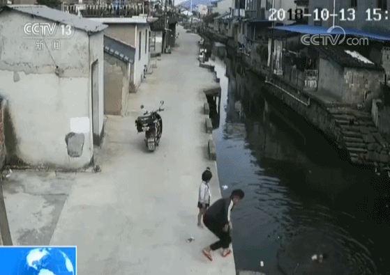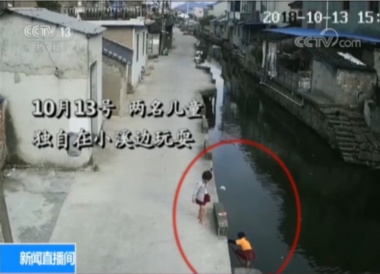 这是监控记录下的画面,10月13号下午三点多,两名小女孩在村口的小溪边玩耍,其中一位在水边洗涤拖把的小女孩不慎踩空滑入水中。