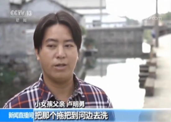 小女孩父亲 卢明勇:那天刚好礼拜六,我们两个大人都上班,两个小孩放在家里面,我小孩在家里面打扫卫生,卫生搞好了,把那个拖把到河边去洗,然后不小心滑到里面去。