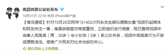 新京报快讯 南昌铁路公安局南昌铁路公安处官方微博10月31日晚发布消息称,针对10月28日网传“G1402次列车发生疑似猥亵女童”视频引起媒体和网友关注一事,南昌铁路警方高度重视,立即组织进行调查,现已查明视频中当事人周某某(男,30岁)与小女孩(5岁)系父女关系,视频中周某某行为不构成猥亵违法。感谢广大网友对社会治安的关心。