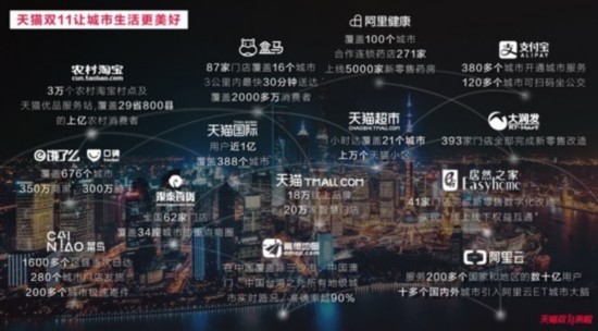 今年是天猫双11第十年。阿里巴巴生态协力打造基于城市的“操作系统”,在满足与创造消费需求的过程中持续推动消费升级,让消费者体验更丰富立体的美好城市生活。来自全球的18万个品牌商家与遍布线下各城市的20万家新零售智慧门店、12座新零售理想之城的100个重点商圈都将参与天猫双11,涵盖人们日常消费的吃喝玩乐等场景。