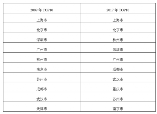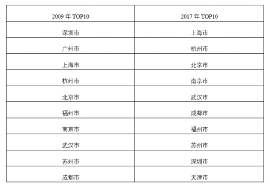 2009年到2017年,天猫双11消费力最强的城市从“上北深广”变成“上北杭深”,杭州增势明显;成都、武汉、重庆也是十年间双11消费增长较快的城市。