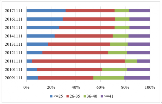 (2009-2017年,25岁以下消费者人数占比逐年提升,消费升级呈现消费群体年轻化趋势。)