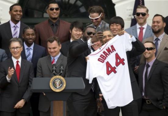 2013年夺冠后红袜队“老爹”奥尔提兹在白宫和美国总统奥巴马的自拍至今被誉为MLB经典时刻