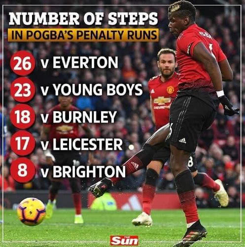 不同的足球运动员,喜欢不同的罚点方式,有些是大刀阔斧型的直接,有的则是喜欢用一些假动作,而博格巴则喜欢用小碎步干扰对手门将。对阵布莱顿的比赛里,在罚点之前,博格巴跑了8步,最终将球打入。在对阵莱斯特城的比赛里,博格巴跑了17步,也成功的将球打入。